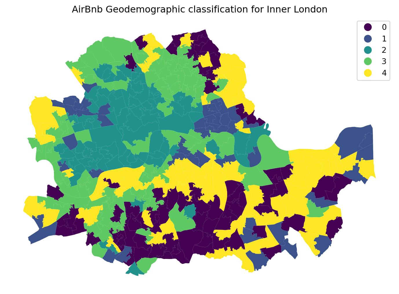 Our goal in this notebook is to create a classification of areas (MSOAs) in Inner London based on the ratings of the AirBnb locations. This will allow us to create a typology for the geography of AirBnb in London and, to the extent the AirBnb locations can say something about the areas where they are located, the classification will help us understand the geography of residential London a bit better. This dataset is a good example of the kind of analyses that the data revolution is making possible as, only a few years ago, it would have been very hard to obtain a similarly large survey of properties with ratings like this one. On the other hand, it is important to keep in mind the biases that these data are subject to and thus the limitations in terms of generalising findings to the general population. In any case, this dataset is a great example to learn about statistical clustering of spatial observations, both in a geodemographic analysis as well as in a regionalisation.