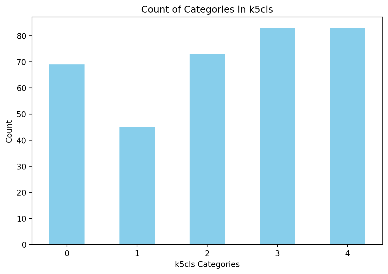 The groupby operator groups a dataframe using the values in the column provided (k5cls) and passes them onto the function provided aftwerards, which in this case is size. Effectively, what this does is to groupby the observations by the categories created and count how many of them each contains. For a more visual representation of the output, a bar plot is a good alternative: