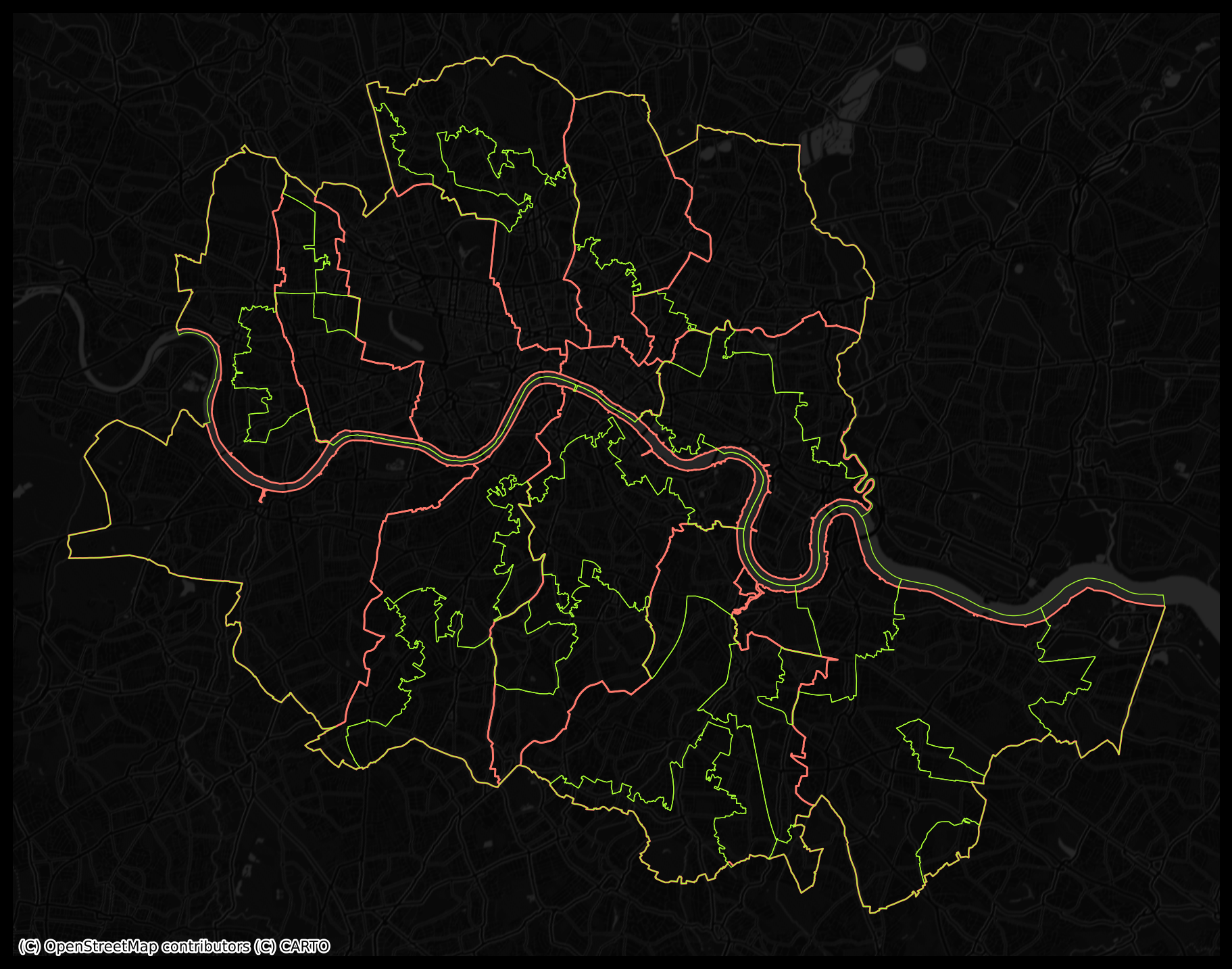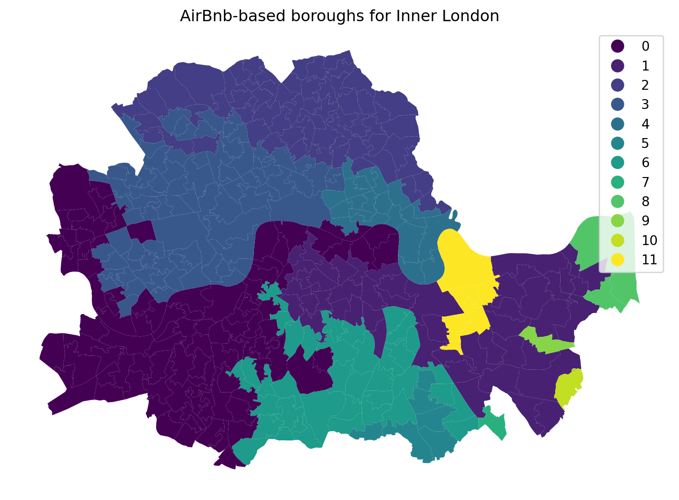 The delineation above provides a view into the geography of AirBnb properties. Each region delineated contains houses that, according to our regionalisation algorithm, are more similar with each other than those in the neighboring areas. Now let’s compare this geography that we have organically drawn from our data with that of the official set of administrative boundaries. For example, with the London boroughs.