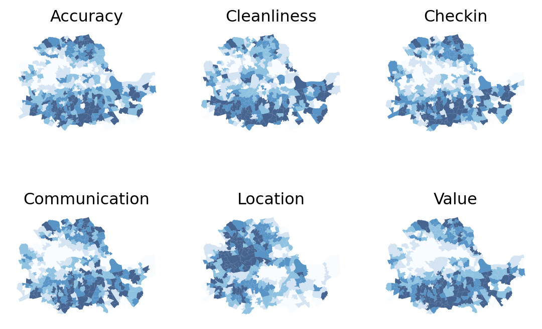 As we can see, there is substantial variation in how the ratings for different aspects are distributed over space. While variables like the overall rating or the communication with the host tend to higher in peripheral areas, others like the location score are more concentrated in the city centre.