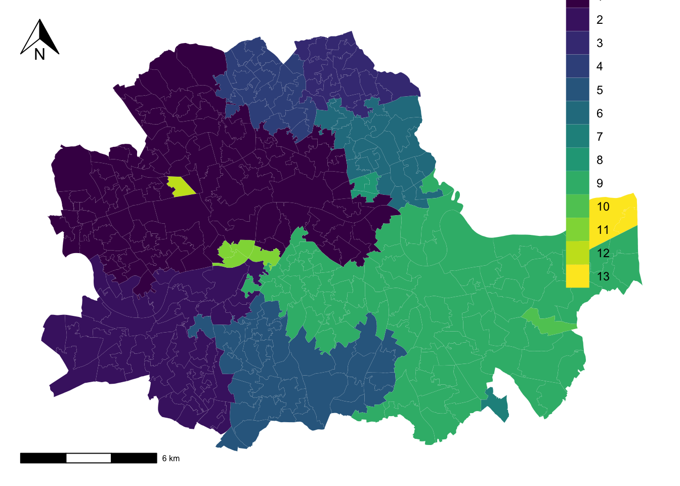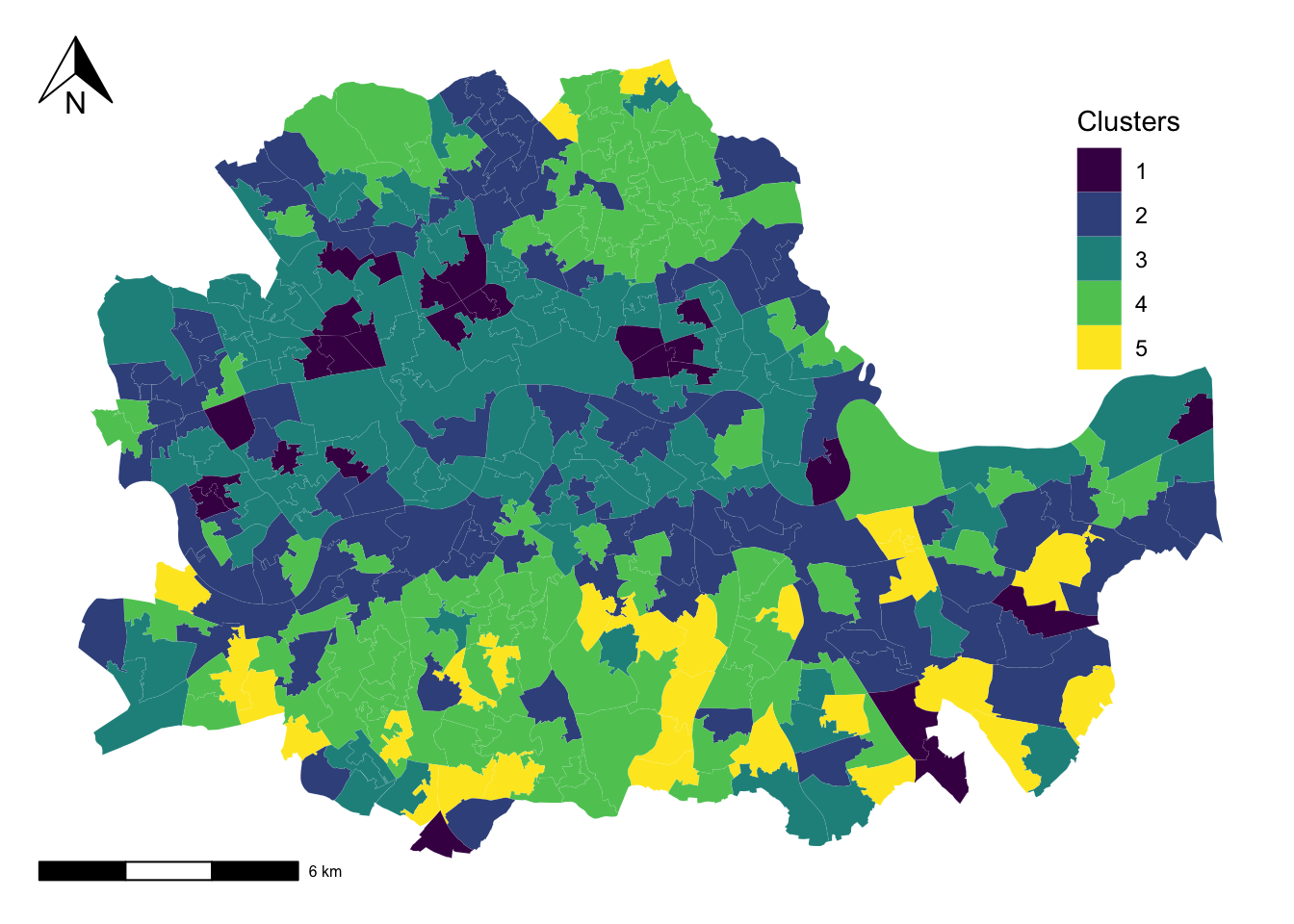 This concludes the section on geodemographics. As we have seen, the essence of this approach is to group areas based on a purely statistical basis: where each area is located is irrelevant for the label it receives from the clustering algorithm. In many contexts, this is not only permissible but even desirable, as the interest is to see if particular combinations of values are distributed over space in any discernible way. However, in other contexts, we may be interested in groups of observations that have been created following certain spatial constraints. For that, we now turn into regionalisation techniques.