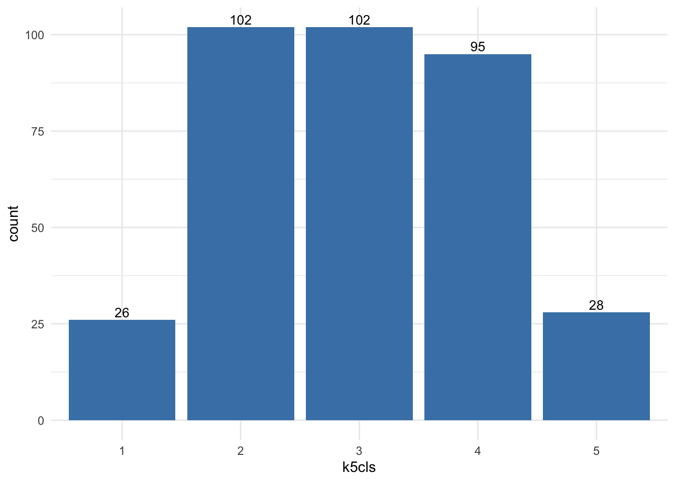group_by(k5cls) %>% # Groups the data by the 'k5cls' column, considering each cluster separately.