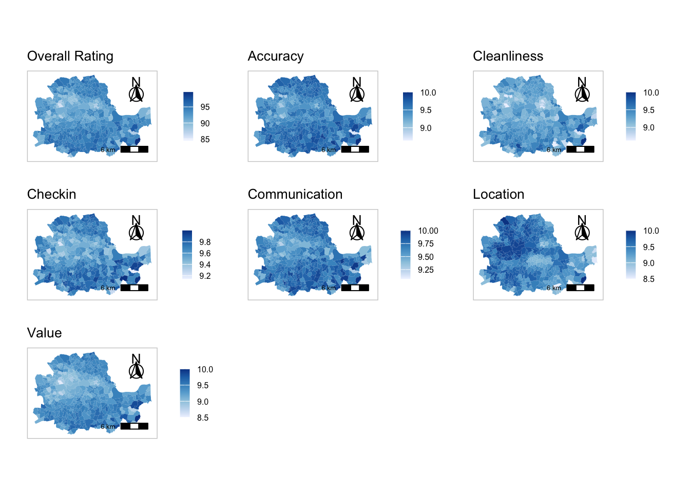 The best way to start exploring the geography of AirBnb ratings is by plotting each of them into a different map. This will give us a univariate perspective on each of the variables we are interested in.