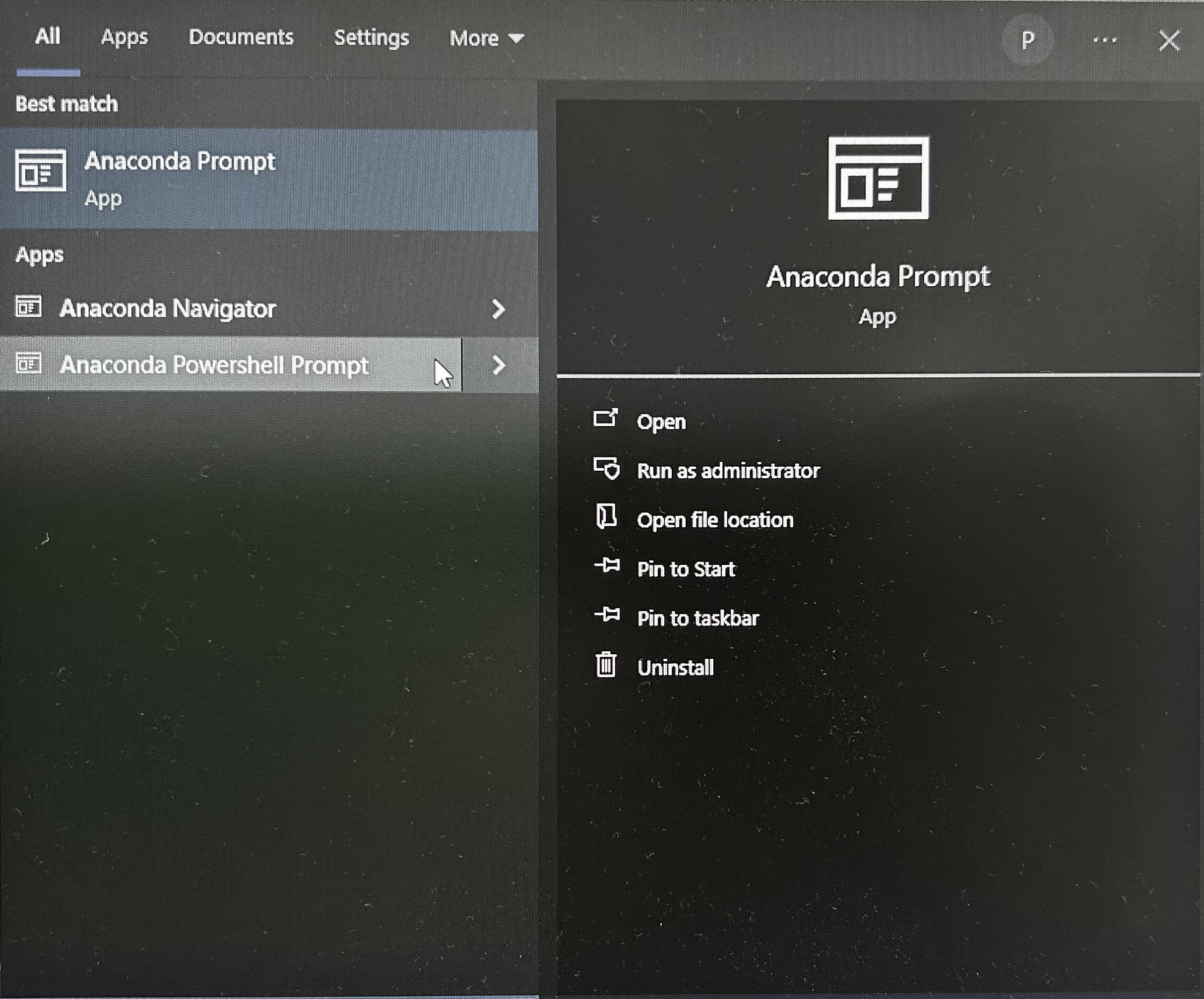 Anaconda Powershell Promptif working on University Machine orAnaconda Prompt (miniconda 3)if on your personal. Launch it. The terminal should appear.