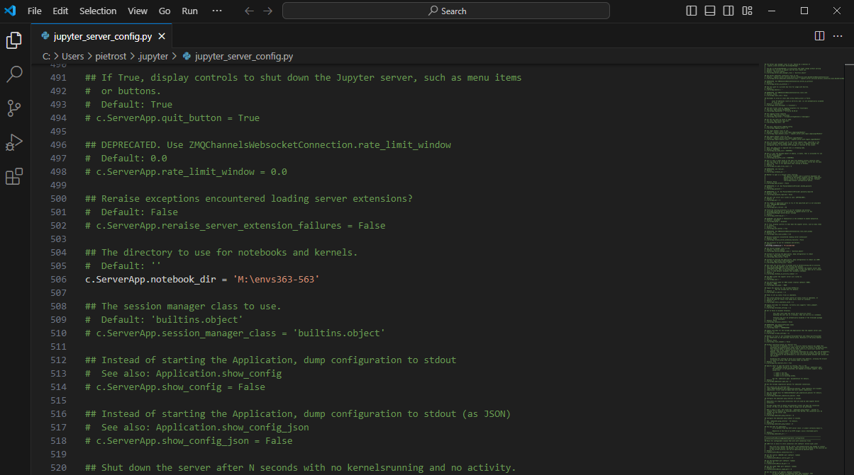 jupyter server --generate-configand press enter. This, at least in Windows, should create a file to:C:\Users\username\.jupyter\jupyter_server_config.py. - Open the file with a text editor (e.g. Notepad++), do a