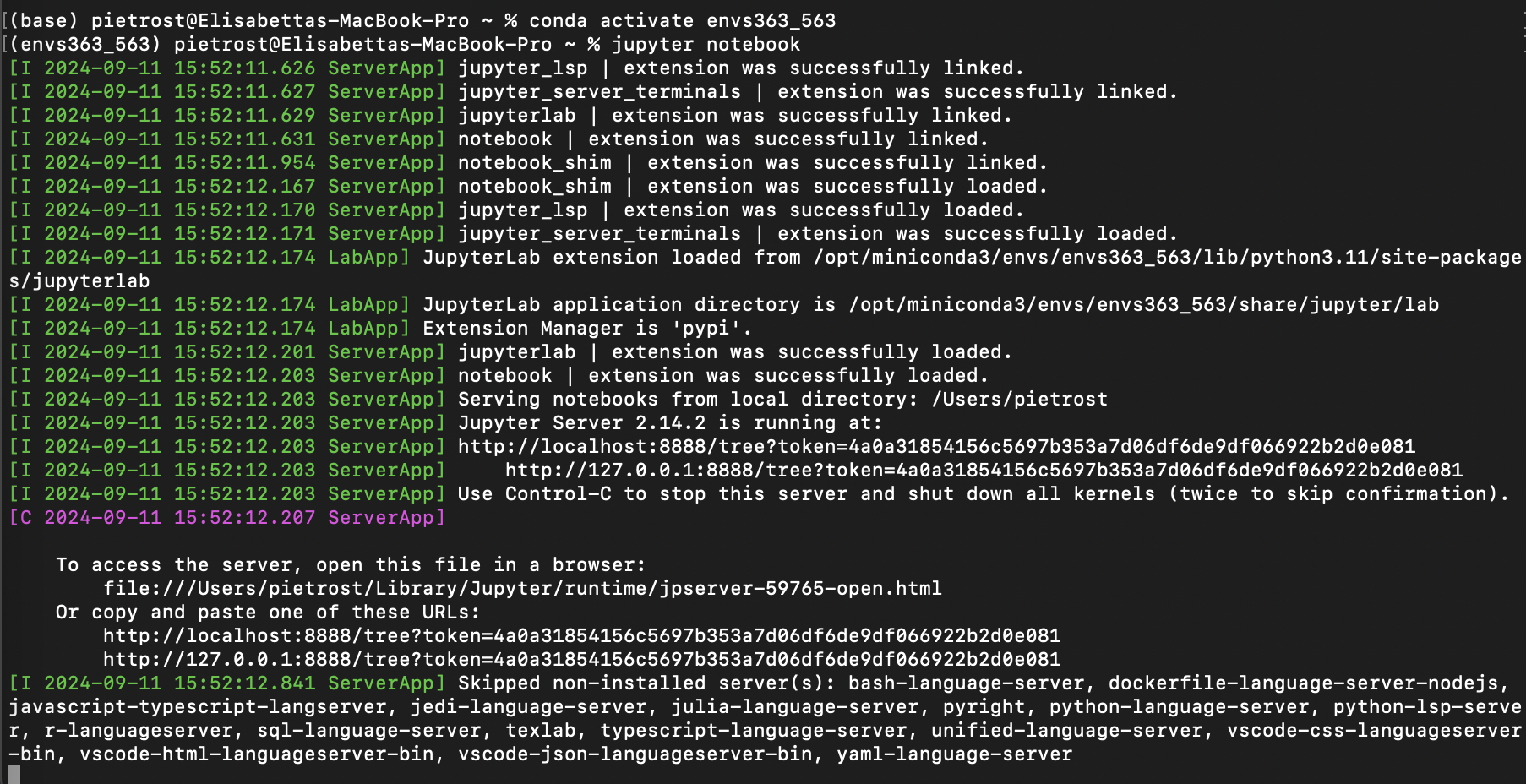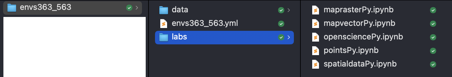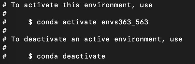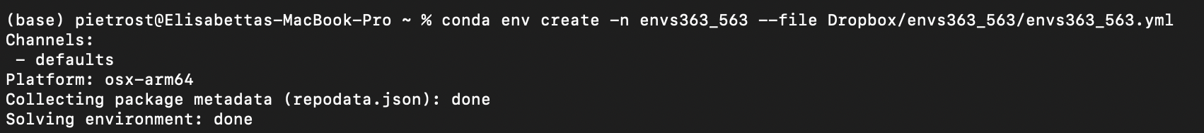 conda env create -n envs363 --file envs363_563.ymland pressEnter. This will need to be modified according to where you placed theenvs363_563folder. For example, Elisabetta has named her folderenvs363_563and it’s in her Dropbox inUsers/PIETROST/Library/CloudStorage/Dropbox/envs363_563/envs363_563.yml. If you created theenvs363_563folder on your desktop, the path would beDesktop/envs363_563.