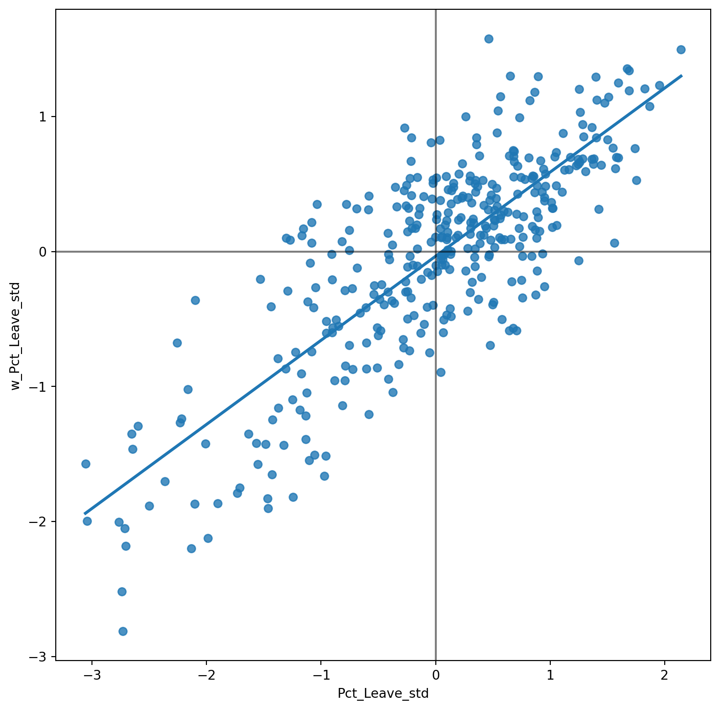 sns.regplot(x='Pct_Leave_std', y='w_Pct_Leave_std', data=br, ci=None)