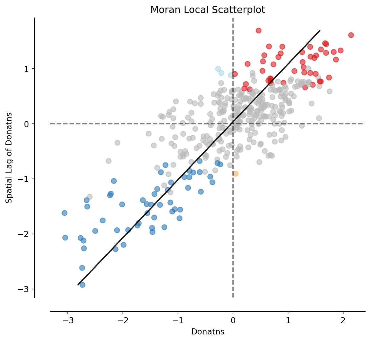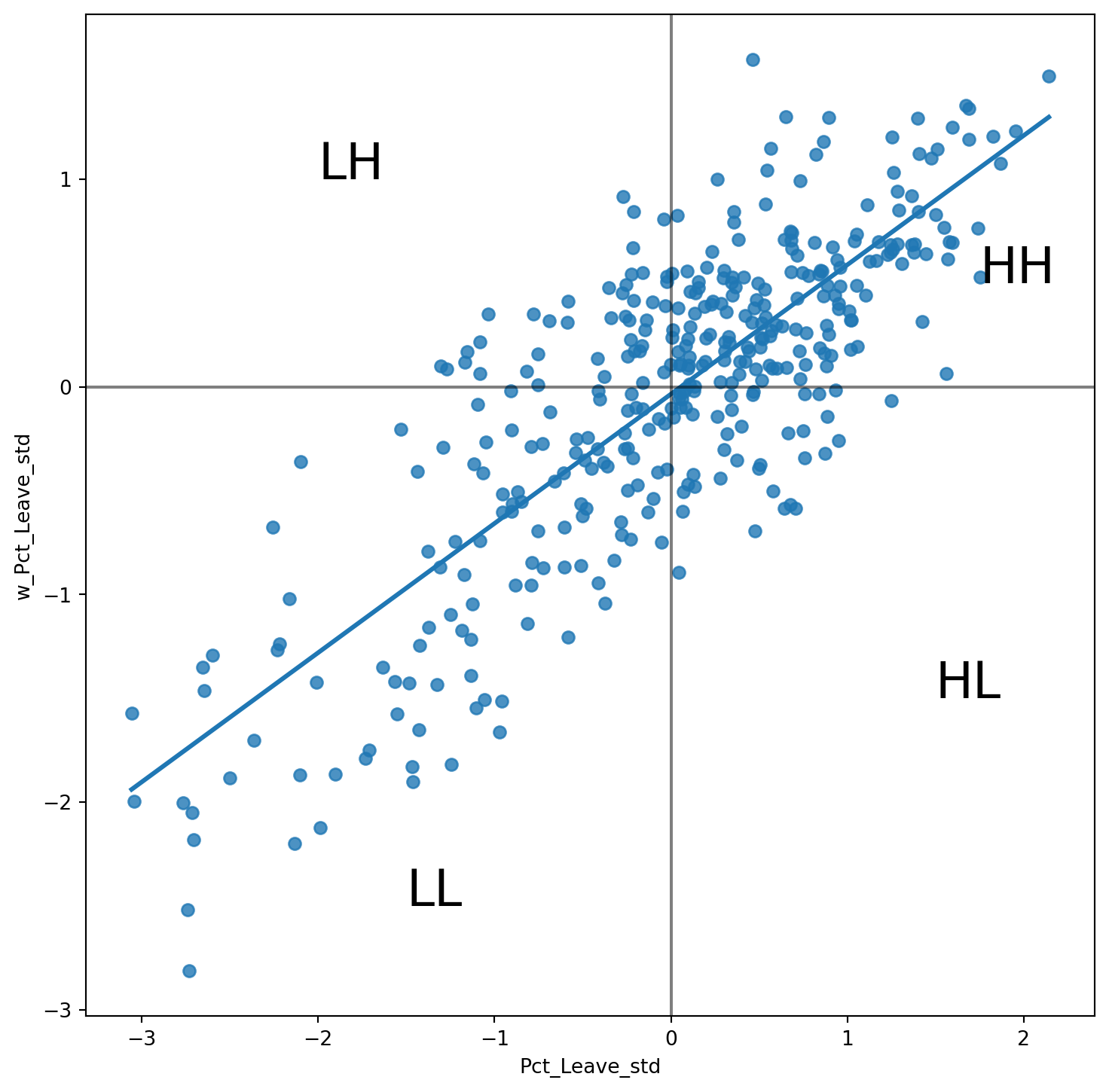 As we saw in the previous lab, creating a Moran Plot is very similar to creating any other scatter plot in Python, provided we have standardised the variable and calculated its spatial lag beforehand: