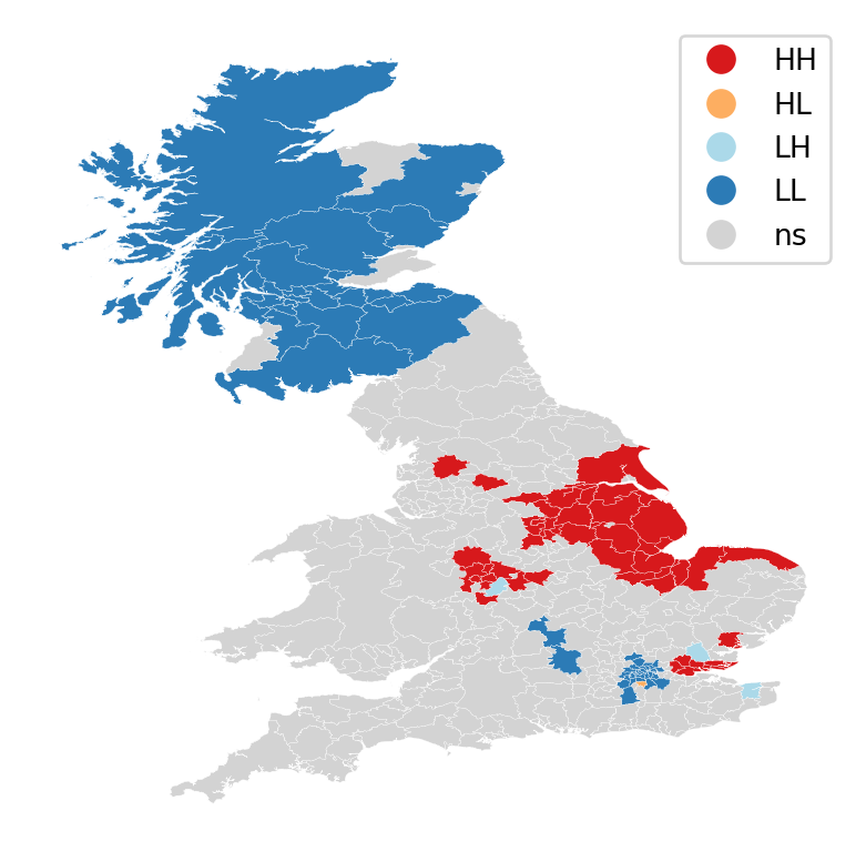 The substantive interpretation of a LISA map needs to relate its output to the original intention of the analyst who created the map. In this case, our original idea was to explore the spatial structure of support to leaving the EU. The LISA proves a fairly useful tool in this context. Comparing the LISA map above with the choropleth we started with, we can interpret the LISA as “simplification” of the detailed but perhaps too complicated picture in the choropleth that focuses the reader’s attention to the areas that display a particularly high concentration of (dis)similar values, helping the spatial structure of the vote emerge in a more explicit way. The result of this highlights the relevance that the East of England and the Midlands had in voting to Leave, as well as the regions of the map where there was a lot less excitement about Leaving.