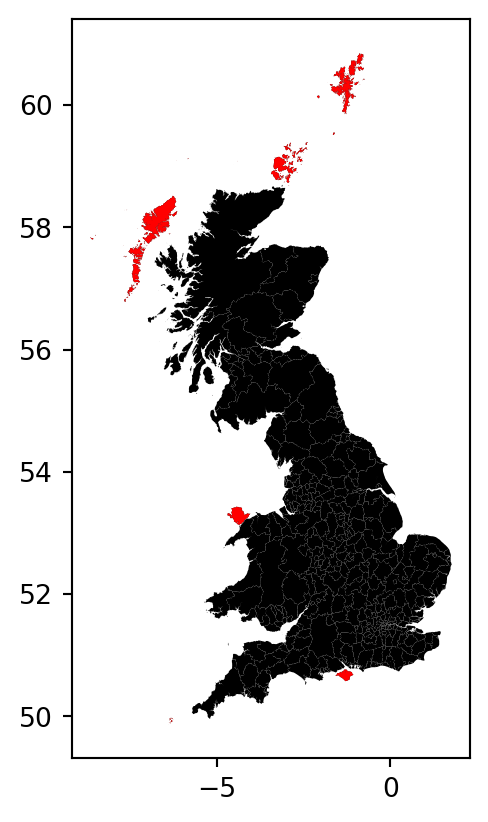 You will likely obtain an warning message when running the cell above since some polygons don’t have neighbours. These neighbourless polygons are called islands and they literally are islands. We can explicitly ask the function to still compute the spatial weights matrix even when some observations might not have neighbours. We can inspect and map them to get a better sense of what we are dealing with: