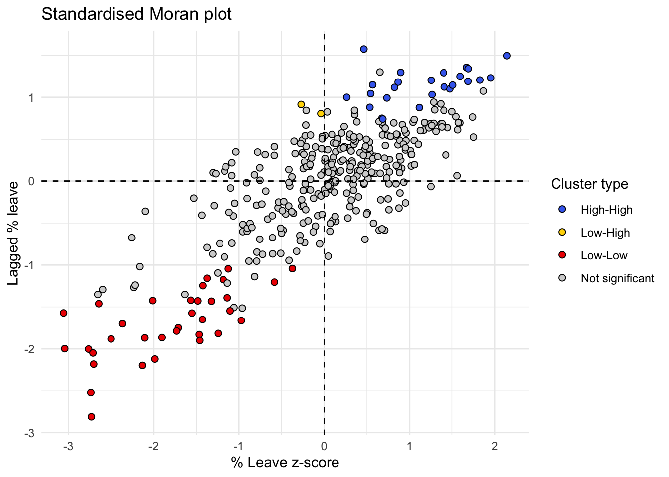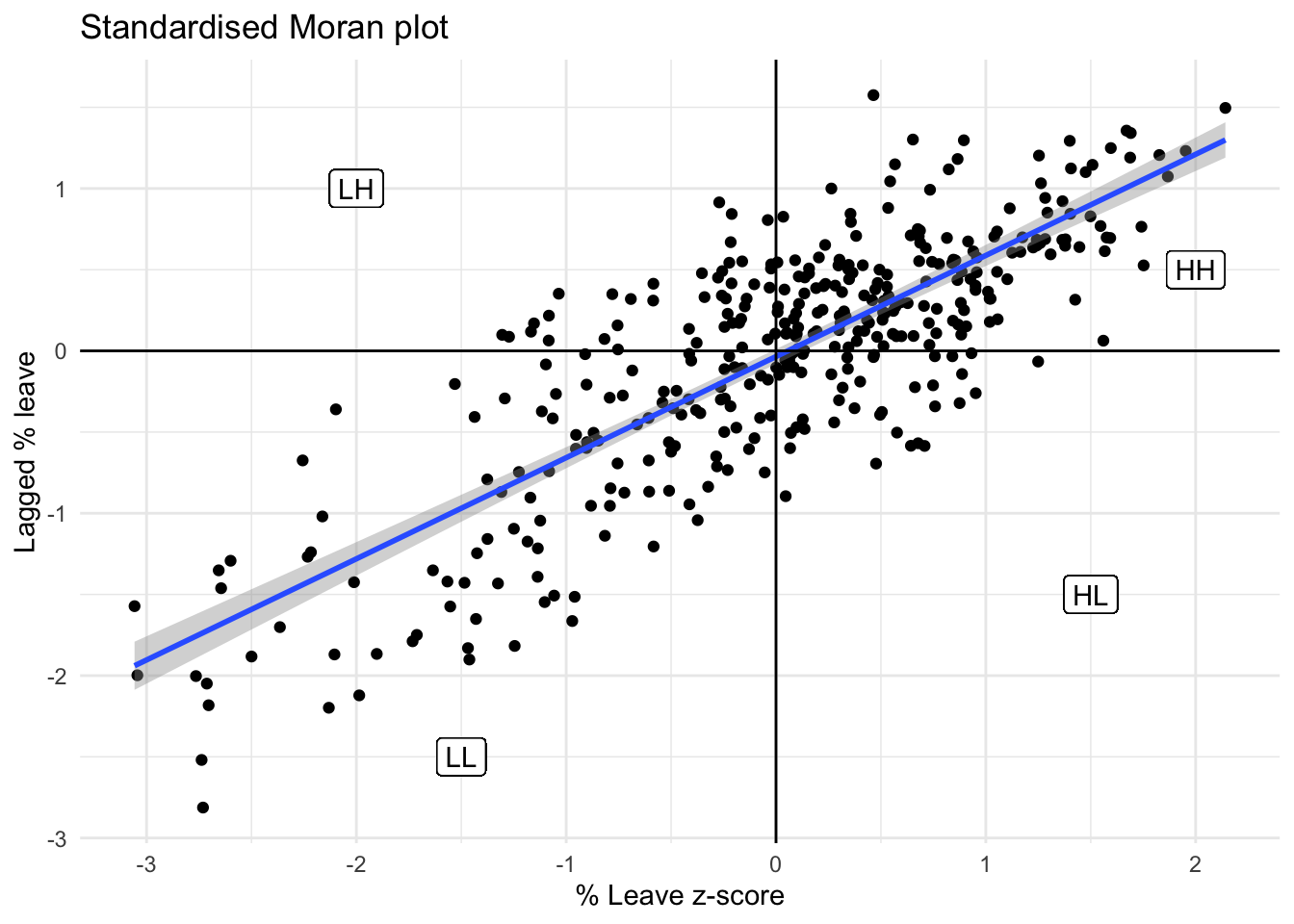labs(title="Standardised Moran plot", x="% Leave z-score", y = "Lagged % leave")