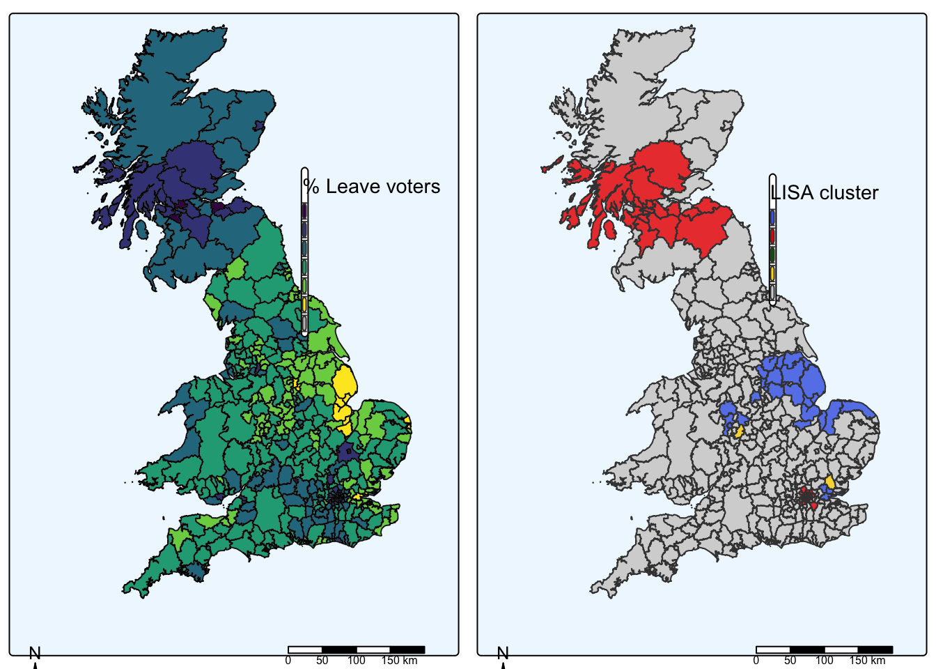 The map above on the right displays the LISA results of the Brexit vote. In blue, we find those local authorities with an unusual high concentration of Leave voters surrounded also by other local authorities with high levels of Leave vote. This corresponds to areas in the East of England, East London and some parts of the Midlands. In red, we find areas with low support for leaving the EU, surrounded by other areas that think alike. The first type of spatial outliers are areas with high support for the Leave vote but which are surrounded by areas with low support. The second type of spatial outliers are areas with low support for the Leave vote but which are surrounded by areas with high support.
