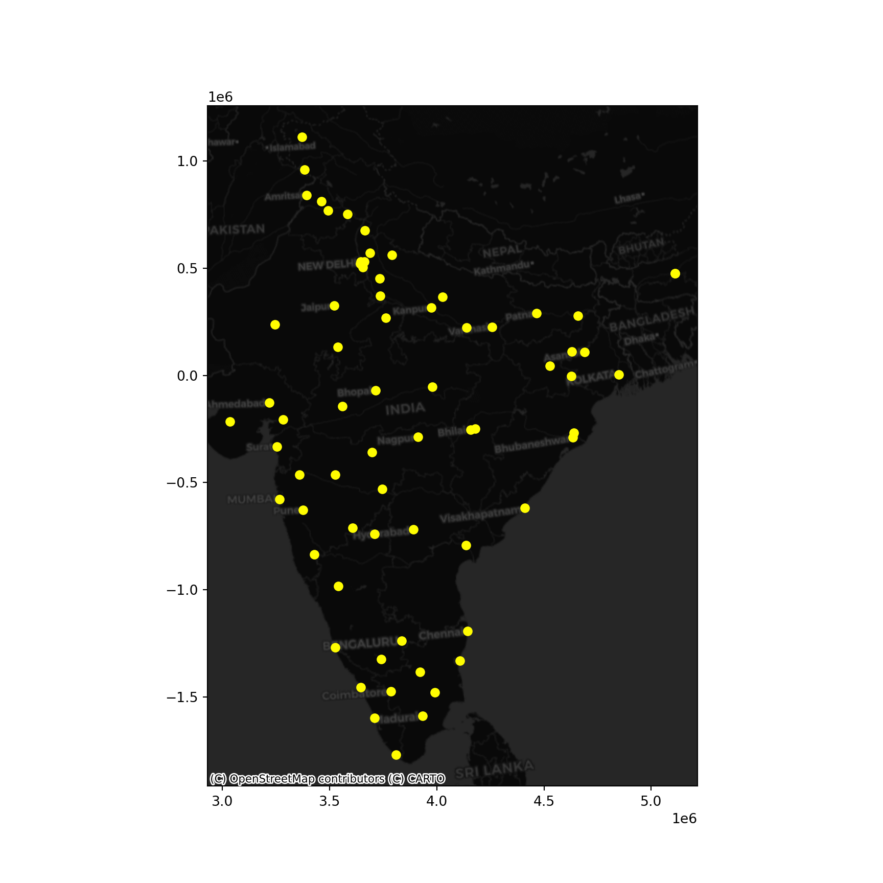 filter(adm0name == "India")places = gpd.read_file("https://d2ad6b4ur7yvpq.cloudfront.net/naturalearth-3.3.0/ne_50m_populated_places_simple.geojson").query("adm0name == 'India'")By default, place locations come expressed in longitude and latitude. Because you will be working with distances, it makes sense to convert the table into a system expressed in metres. For India, this can be the “Kalianpur 1975 / India zone I” (EPSG:24378) projection.