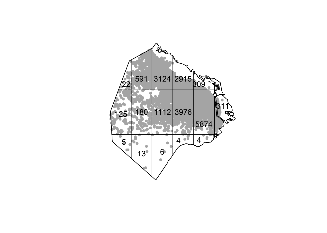 This approach is intuitive but of course raises the following question: what polygons do we use to aggregate the points? Ideally, we want a boundary delineation that matches as closely as possible the point generating process and partitions the space into areas with a similar internal intensity of points. However, that is usually not the case, no less because one of the main reasons we typically want to visualize the point pattern is to learn about such generating process, so we would typically not know a priori whether a set of polygons match it. If we cannot count on the ideal set of polygons to begin with, we can adopt two more realistic approaches: using a set of pre-existing irregular areas or create a artificial set of regular polygons. Let’s explore both.