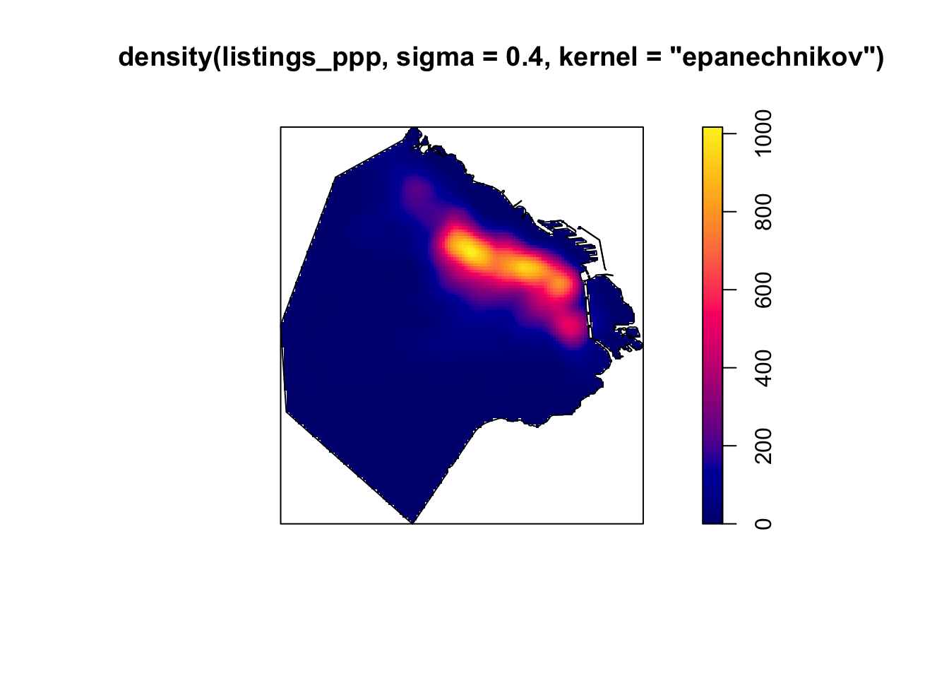plot(density(listings_ppp, sigma=0.4, kernel="epanechnikov"))
