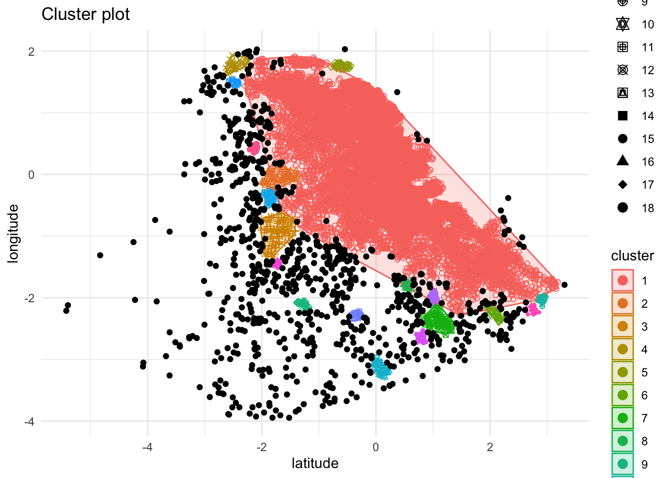 db <- dbscan::dbscan(locs.scaled, eps=0.10, minPts = 10)