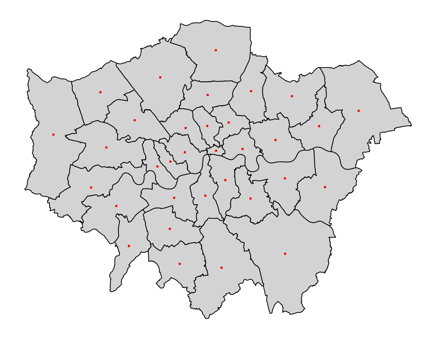 Now let’s look at the different types of geographical data starting with polygons. We will use a dataset that contains the boundaries of the districts of London. We can read it into an object named districts.