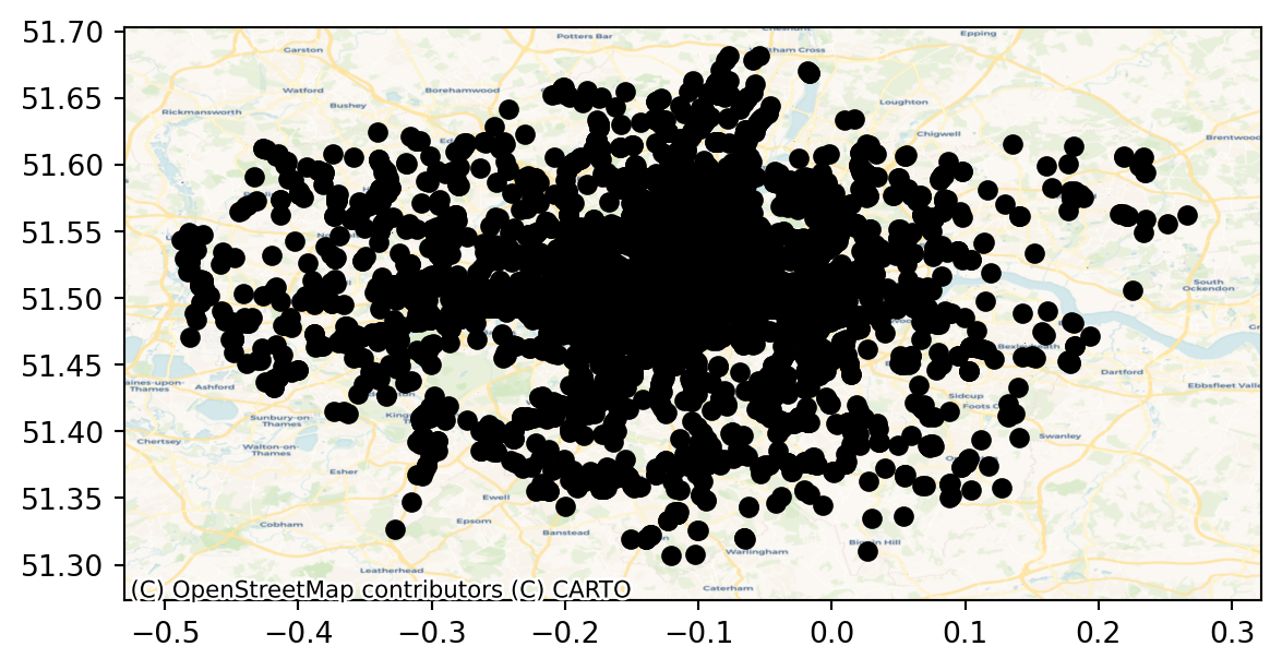 Note that we need to be explicit when adding the basemap to state the coordinate reference system (crs) our data is expressed in, contextily will not be able to pick it up otherwise. Conversely, we could change our data’s CRS into Pseudo-Mercator, the native reference system for most web tiles: