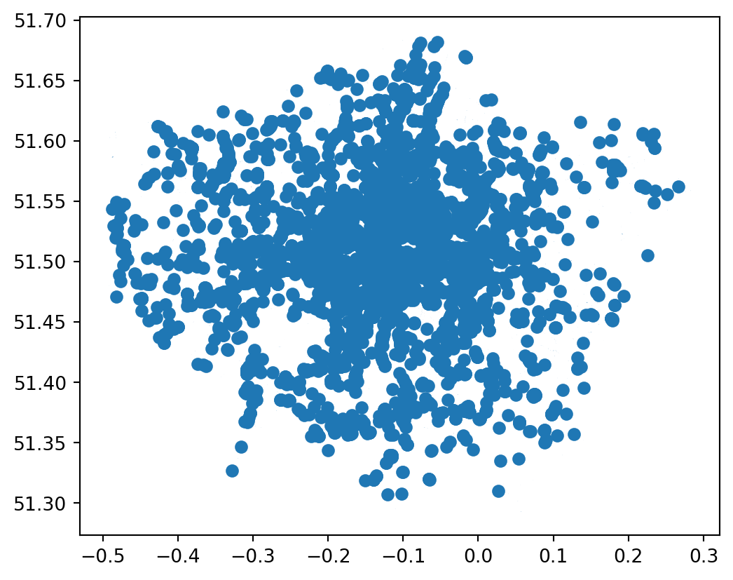 Note that we use the method features_from_place, which queries for points in a particular place (London in this case) and creates a GeoDataFrame of OSM features.