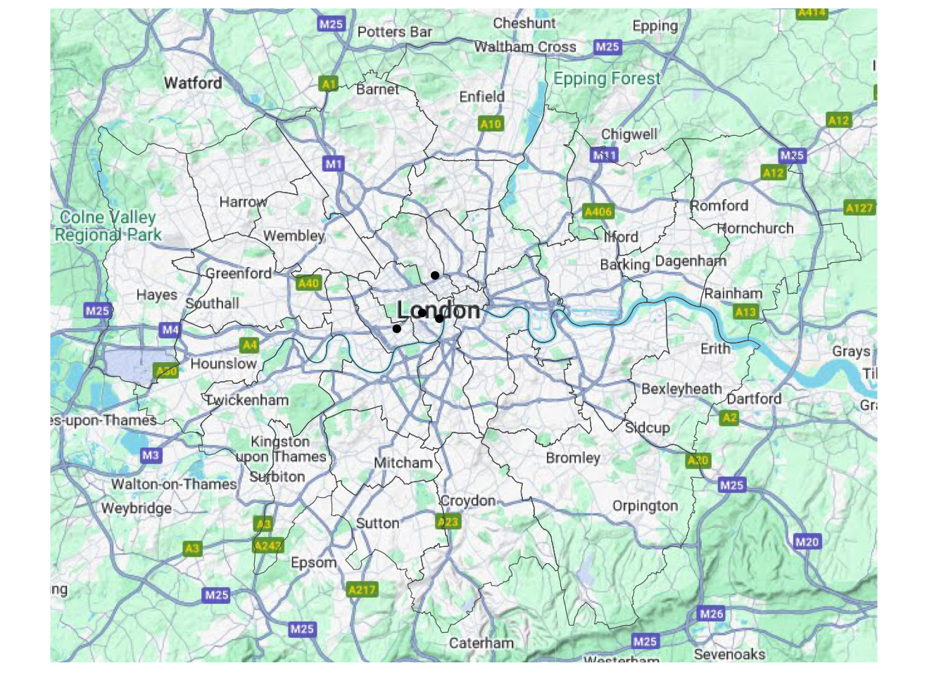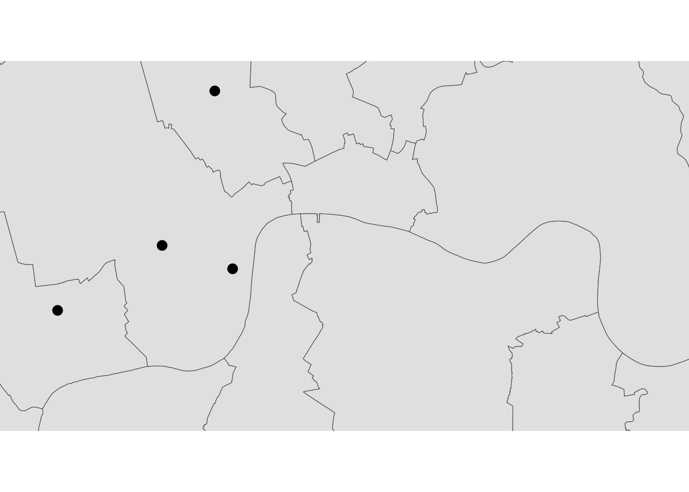 addMarkers(lng = c(-0.1459604, -0.1272057, -0.1319481, -0.173734),