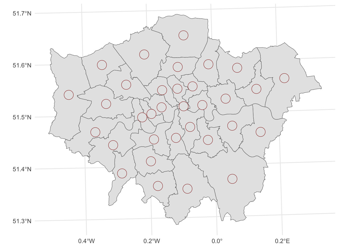 geom_sf(data = centroid_buffers, color = "darkred", size = 2) + # Plot the buffers of the centroids