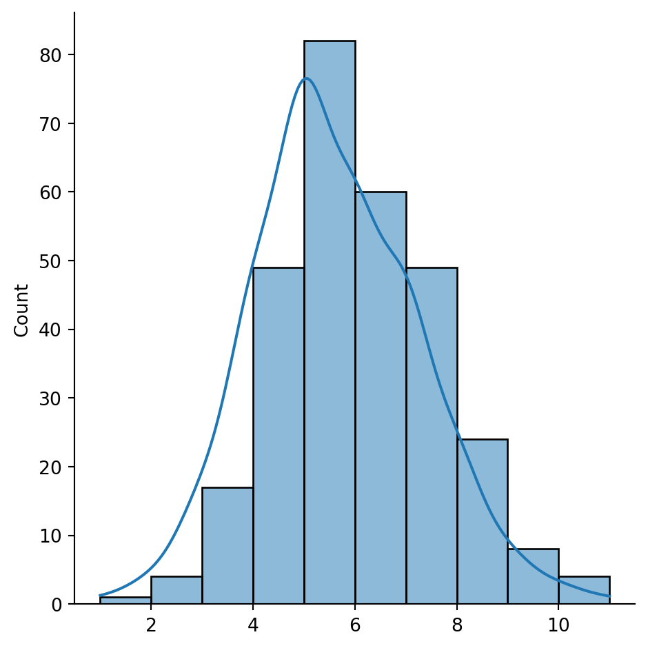 The figure above shows how most observations have around five neighbors, but there is some variation around it. The distribution also seems to follow a symmetric form, where deviations from the average occur both in higher and lower values almost evenly.