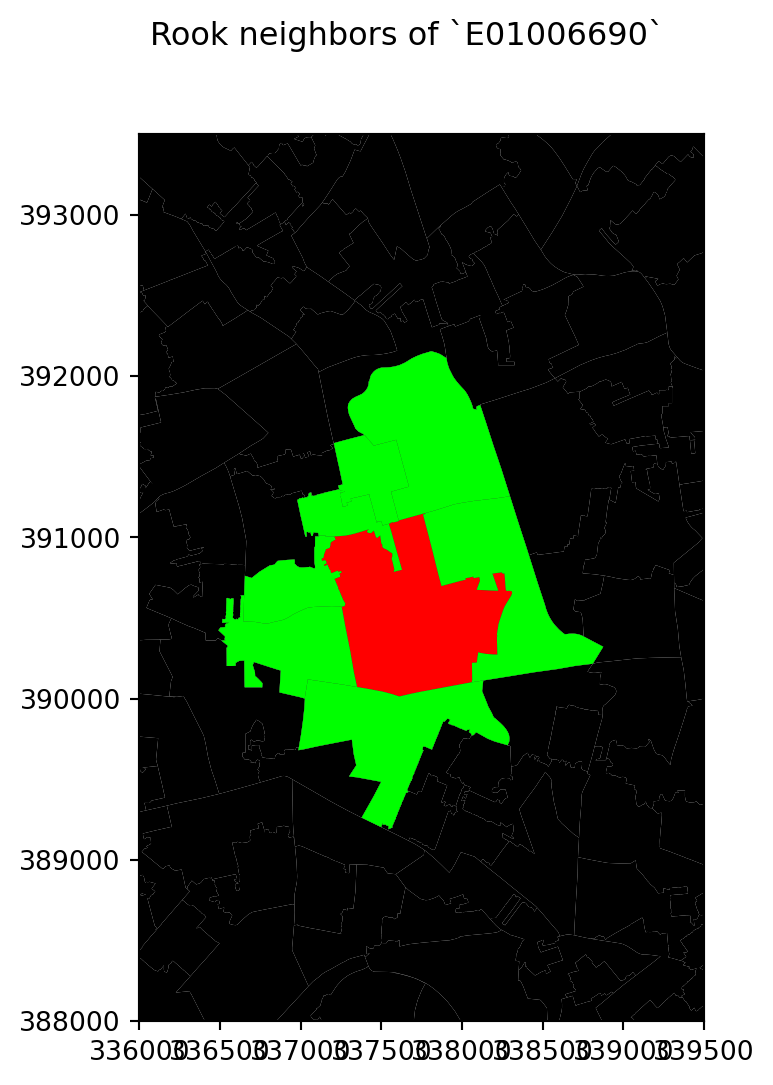 Rook contiguity is similar to and, in many ways, superseded by queen contiguity. However, since it sometimes comes up in the literature, it is useful to know about it. The main idea is the same: two observations are neighbors if they share some of their boundary lines. However, in the rook case, it is not enough with sharing only one point, it needs to be at least a segment of their boundary. In most applied cases, these differences usually boil down to how the geocoding was done, but in some cases, such as when we use raster data or grids, this approach can differ more substantively and it thus makes more sense.