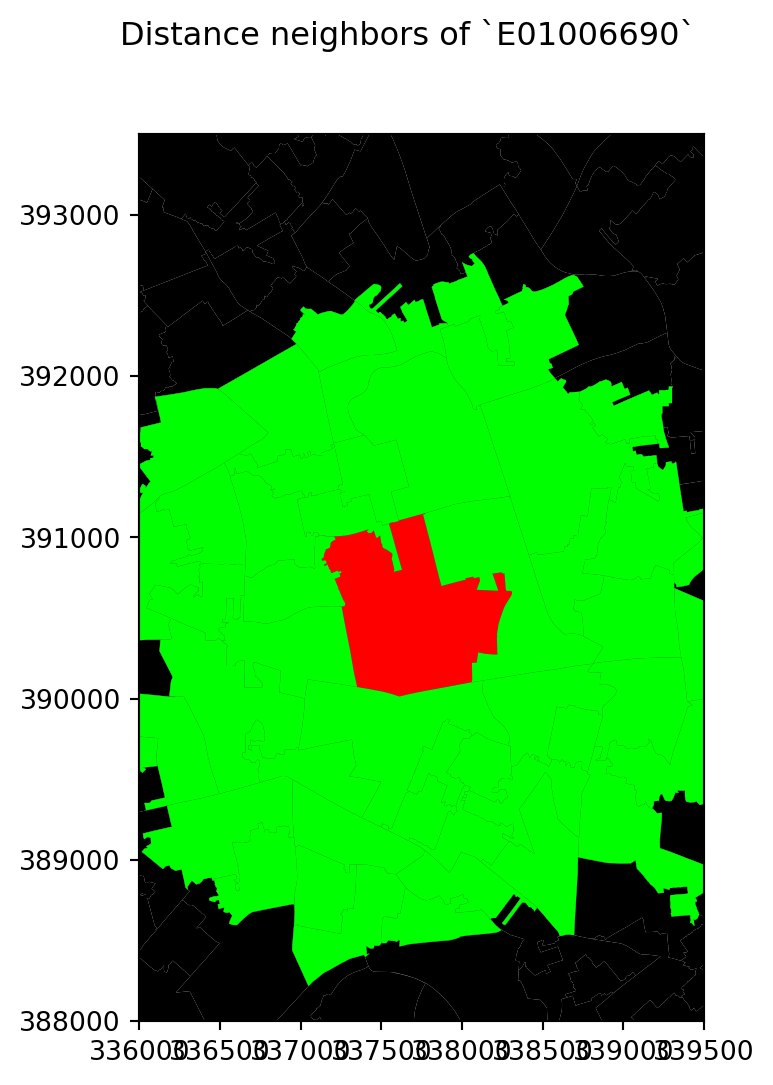 Following this logic of more detailed weights through distance, there is a temptation to take it further and consider everyone else in the dataset as a neighbor whose weight will then get modulated by the distance effect shown above. However, although conceptually correct, this approach is not always the most computationally or practical one. Because of the nature of spatial weights matrices, particularly because of the fact their size is \(N\) by \(N\) if all the neighbours are present, they can grow substantially large. A way to cope with this problem is by making sure they remain fairly sparse (with many zeros). Sparsity is typically ensured in the case of contiguity or KNN by construction but, with inverse distance, it needs to be imposed as, otherwise, the matrix could be potentially entirely dense (no zero values other than the diagonal). In practical terms, what is usually done is to impose a distance threshold beyond which no weight is assigned and interaction is assumed to be non-existent, as we did here by setting this threshold to 2,000 meters. Beyond being computationally feasible and scalable, results from this approach usually do not differ much from a fully “dense” one as the additional information that is included from further observations is almost ignored due to the small weight they receive.