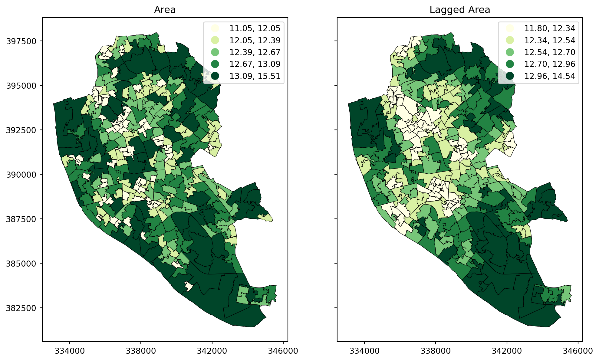 df.plot(column='area', cmap='YlGn', scheme='quantiles', k=5, legend=True, ax=ax1, edgecolor='black', linewidth=0.5)