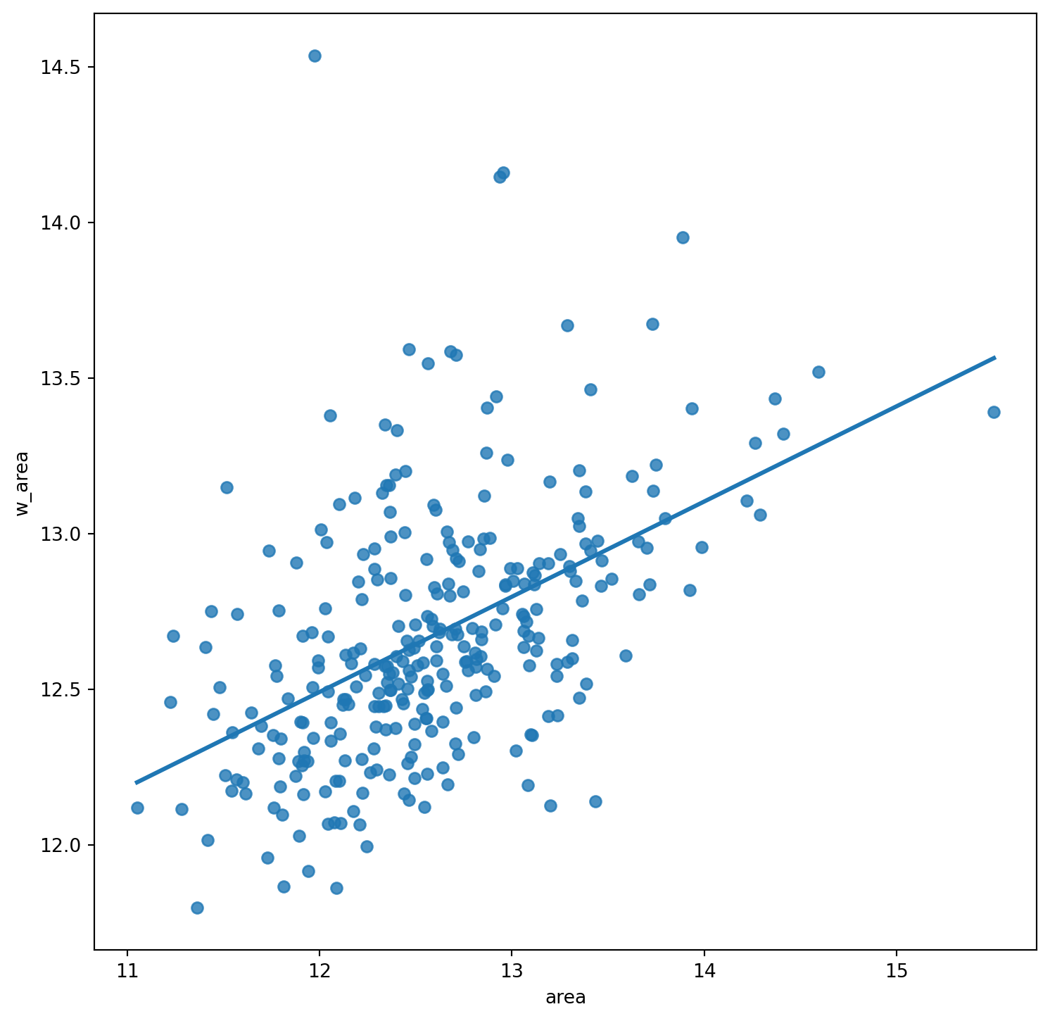 sns.regplot(x="area", y="w_area", data=df, ci=None)
