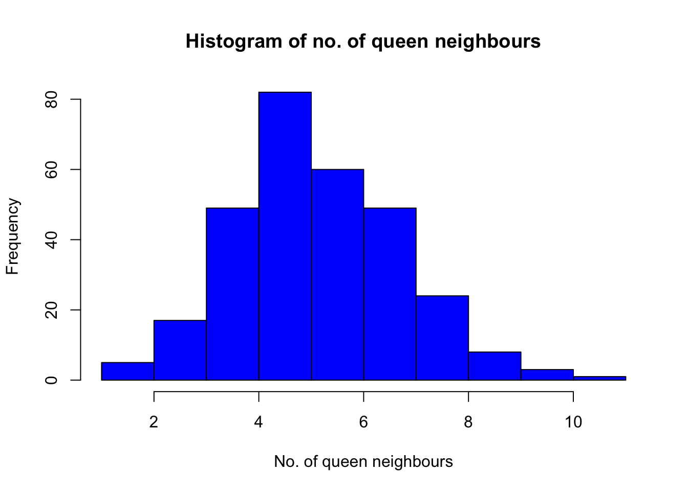 hist(nb_counts_q$num_nb_q, breaks = 10, col = "blue", main = "Histogram of no. of queen neighbours", xlab = "No. of queen neighbours")