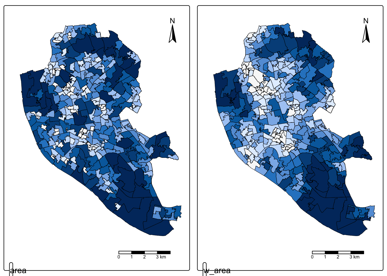 df$w_area <- area.lagWe can create two choropleth maps, side to side, showing the values of the variable area in each polygon and of the lagged area:
