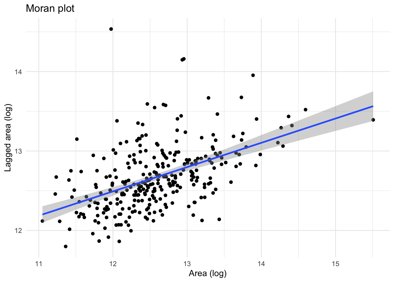 labs(title="Moran plot", x="Area (log)", y = "Lagged area (log)")