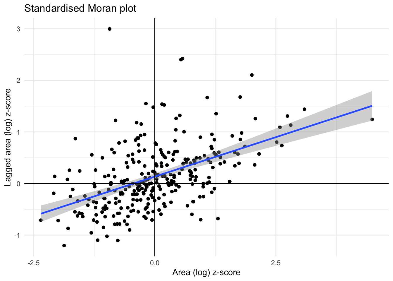 labs(title="Standardised Moran plot", x="Area (log) z-score", y = "Lagged area (log) z-score")