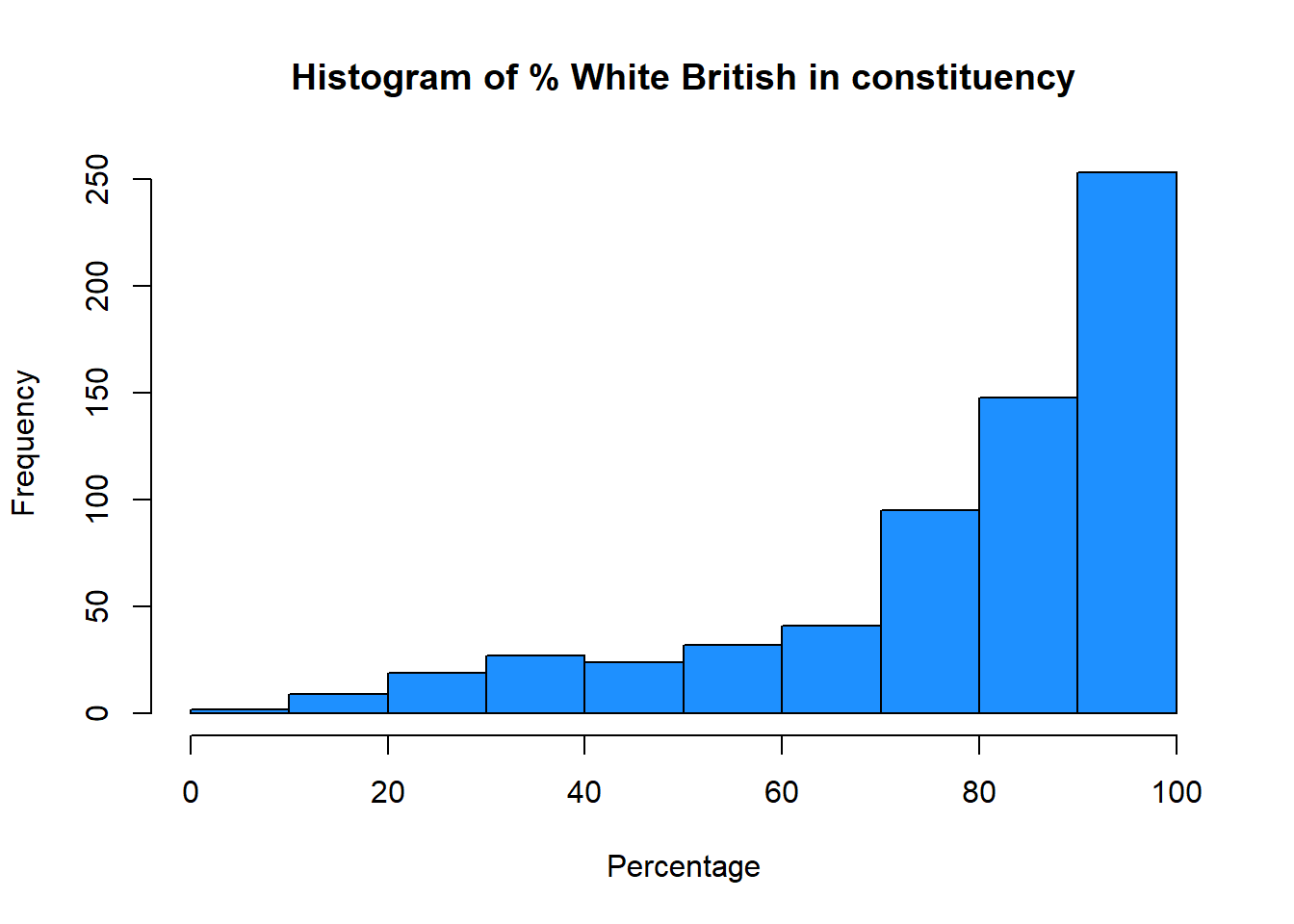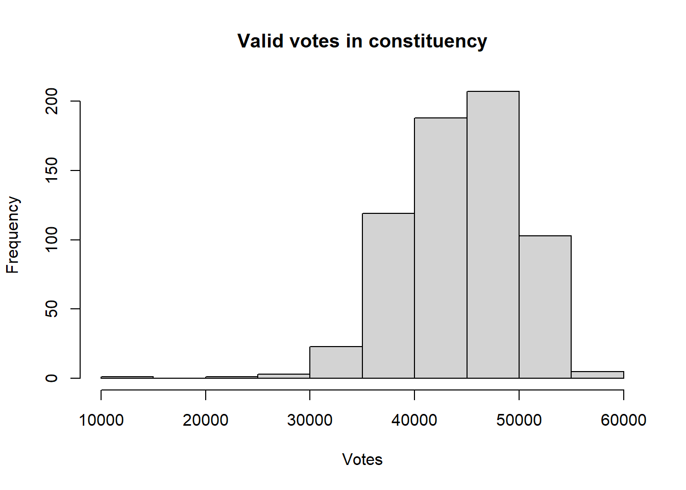 A visual approach is more intuitive. The code below plots histograms of the two variables, using the hist function. The logic under-pinning a histogram is that a continuous variable (in this case valid_votes and pct_White_British) is temporarily regrouped into categories, using an equal-interval approach. The number of observations (in this case, constituencies) that fall into each equal-interval category then determine the height of each column in the histogram.The comments after each line shall inform you what the main and xlab in the function mean: