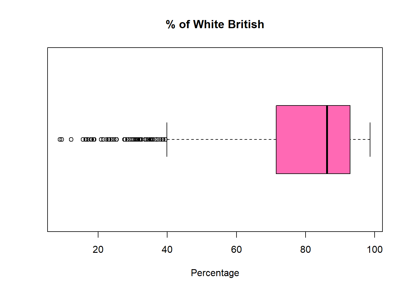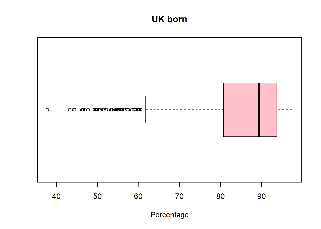 boxplot(pc_data$pct_UK_born ,horizontal=TRUE, main = "UK born", xlab='Percentage', col = "pink")