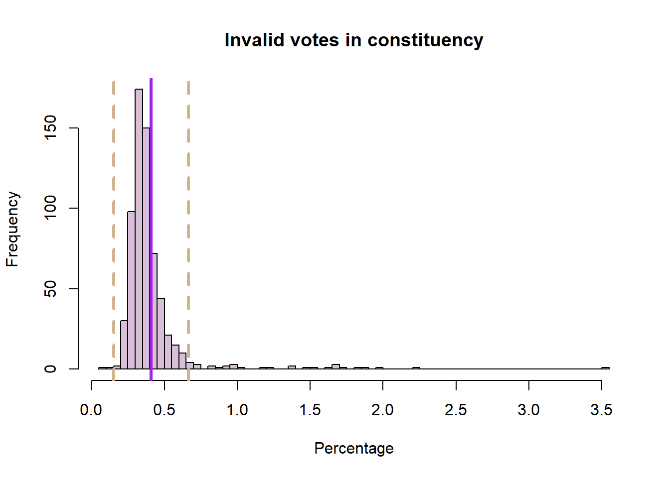 hist(pc_data$pct_invalid_votes, col = "thistle", main = "Invalid votes in constituency", xlab = "Percentage", breaks = 50)