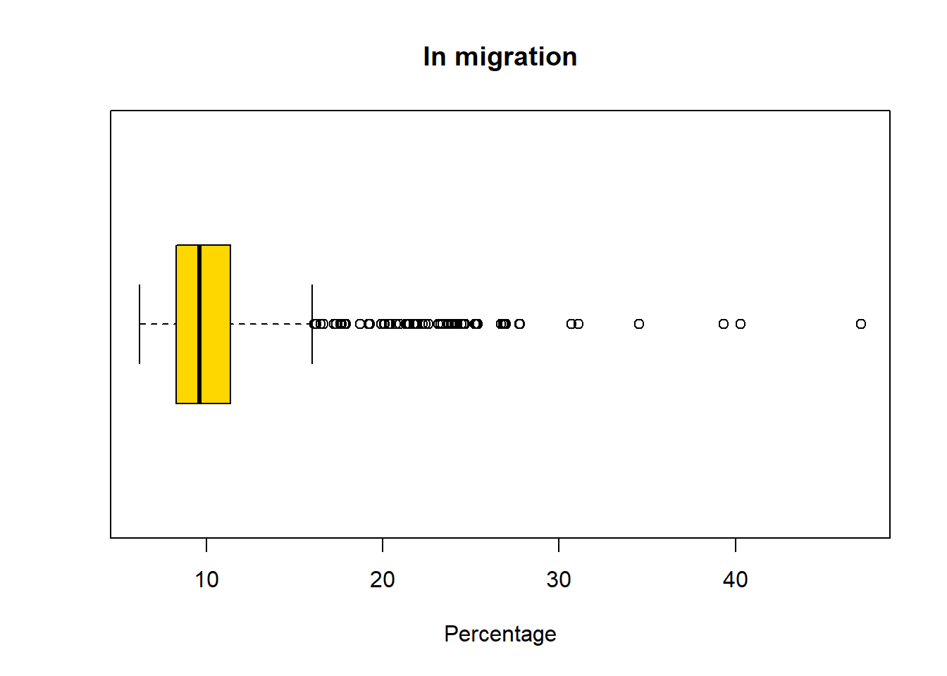 boxplot(pc_data$pct_in_migration,horizontal=TRUE, main = "In migration", xlab='Percentage', col = "gold")