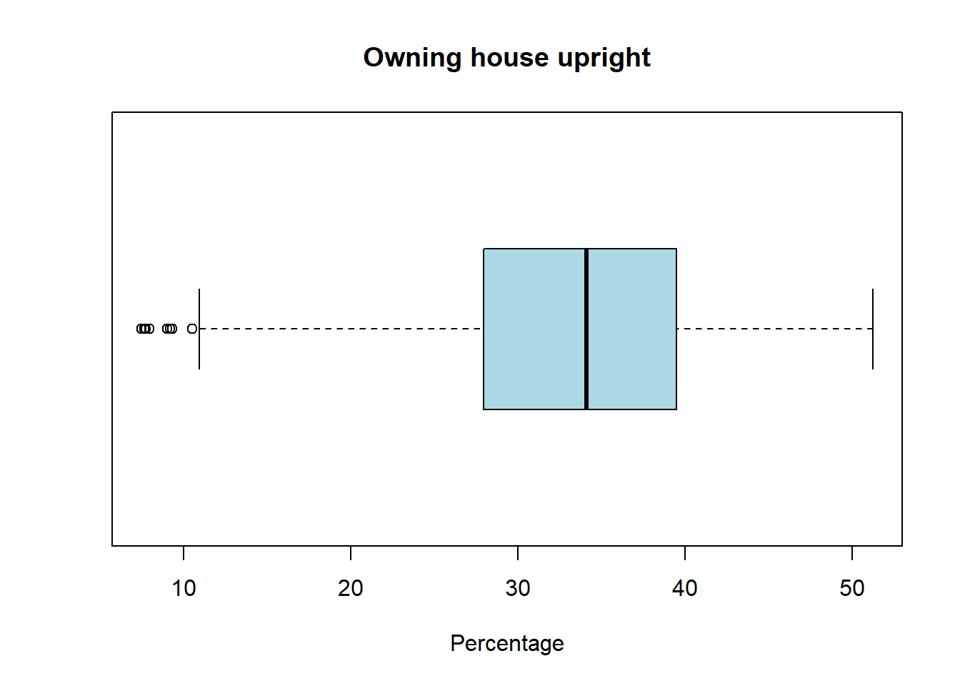 boxplot(pc_data$pct_owned,horizontal=TRUE, main = "Owning house upright", xlab='Percentage', col = "lightblue")