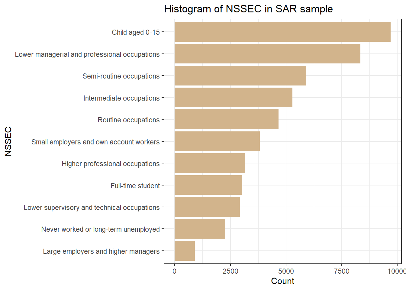 ggplot(sar_label, aes(x =fct_rev(fct_infreq(nssec)))) +geom_bar(fill ="tan") +labs(title ="Histogram of NSSEC in SAR sample", x ="NSSEC", y ="Count") +coord_flip()+#Flip the Axes, add a # in front of this line, to make the code in gray and you will see why we would better flip the axes at heretheme_bw()