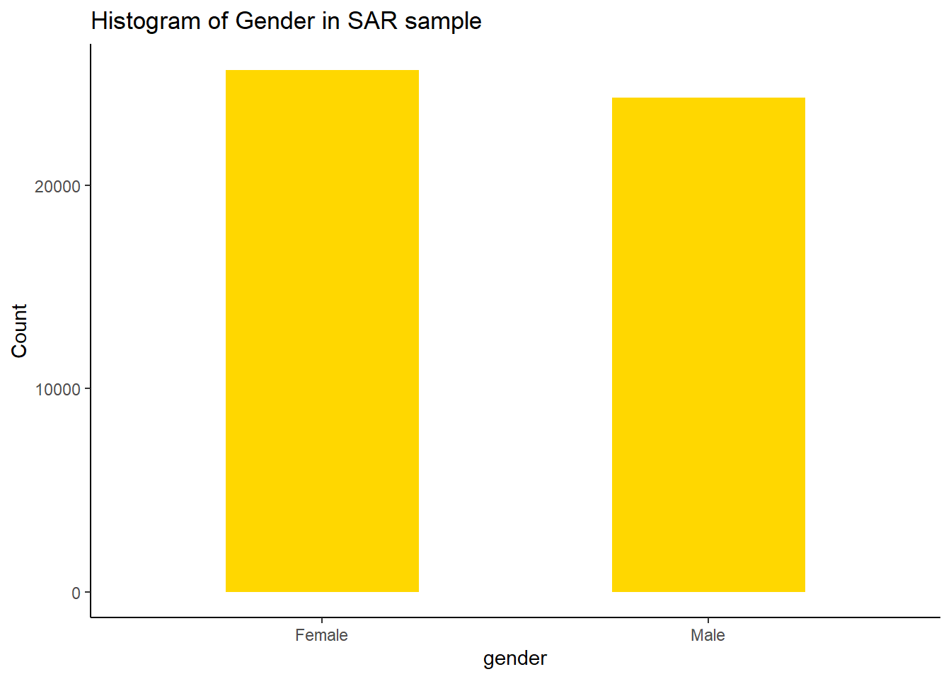 ggplot(sar_label, aes(x = sex)) +geom_bar(fill="gold",width=0.5) +labs(title ="Histogram of Gender in SAR sample", x ="gender", y ="Count")+#set text infotheme_classic()#choose theme type, try theme_bw(), theme_minimal() see differences
