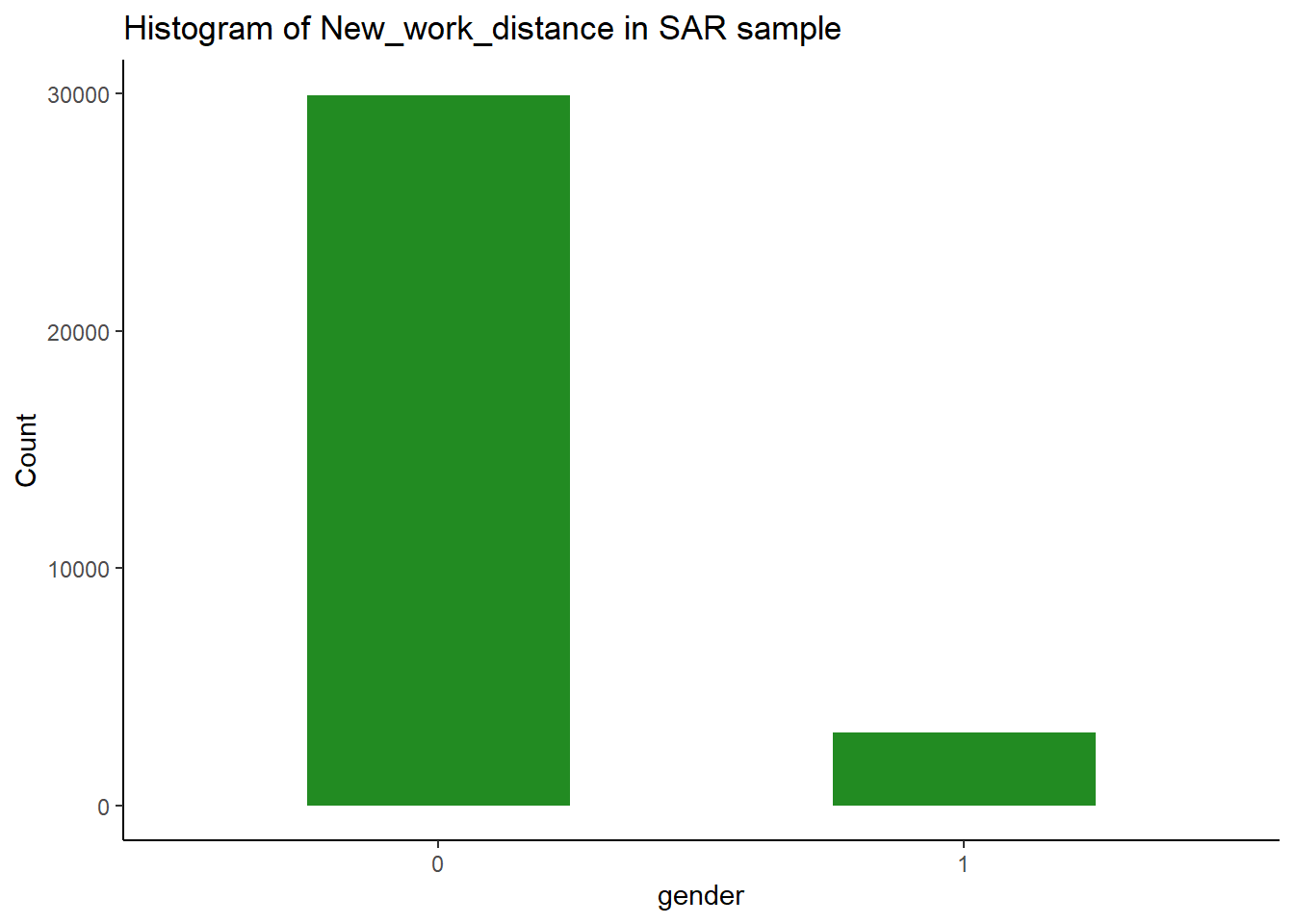 ggplot(sar_df, aes(x =as.factor(New_work_distance))) +geom_bar(fill="forestgreen",width=0.5) +labs(title ="Histogram of New_work_distance in SAR sample", x ="gender", y ="Count")+#set text infotheme_classic()#choose theme type, try theme_bw(), theme_minimal() see differences