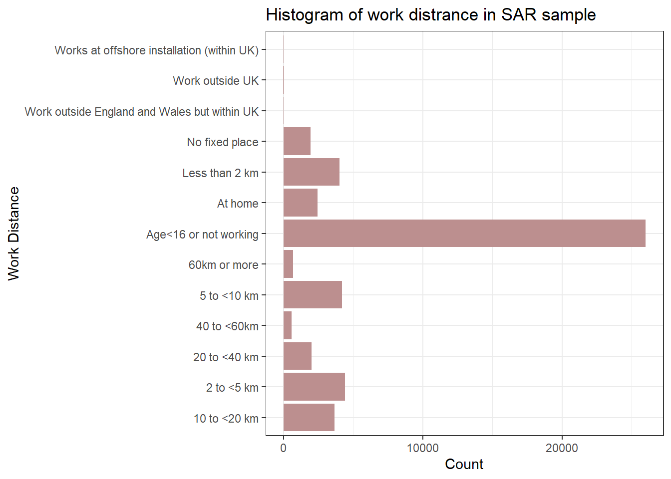 Now we can use the frequency and the bar chart to report that according to our definition of long-distance travelling to work (over 60 km), there are 3072 individual are long-distance commuters in the SAR sample, which makes up 6.14% (3072/50000) of the sample.