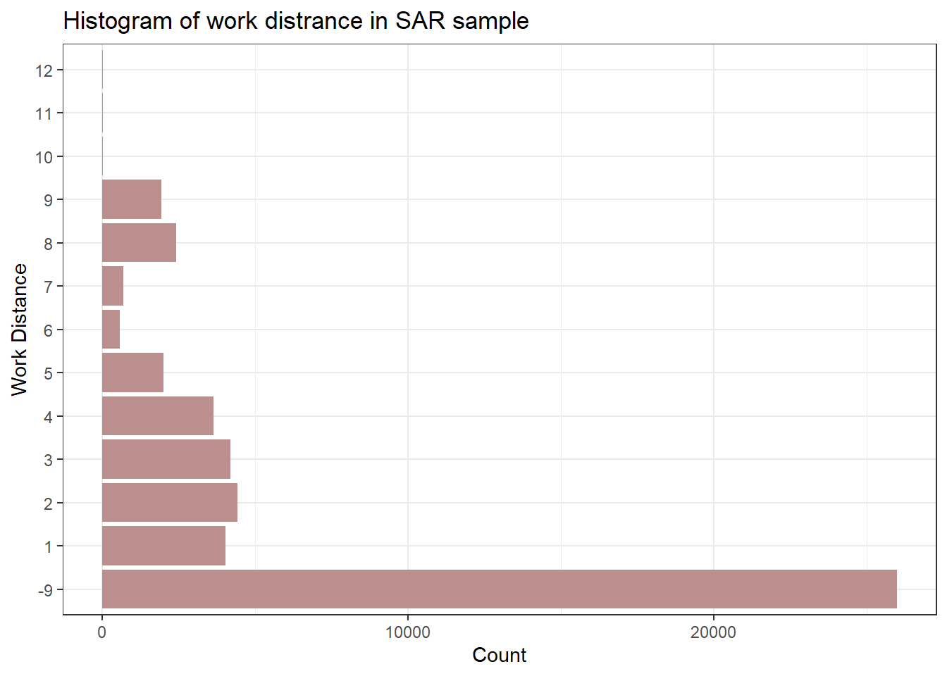 library(ggplot2)ggplot(sar_label, aes(x = work_distance)) +geom_bar(fill ="rosybrown") +labs(title ="Histogram of work distrance in SAR sample", x ="Work Distance", y ="Count") +coord_flip()+#Flip the Axes, add a # in front of this line, to make the code in gray and you will see why we would better flip the axes at heretheme_bw()
