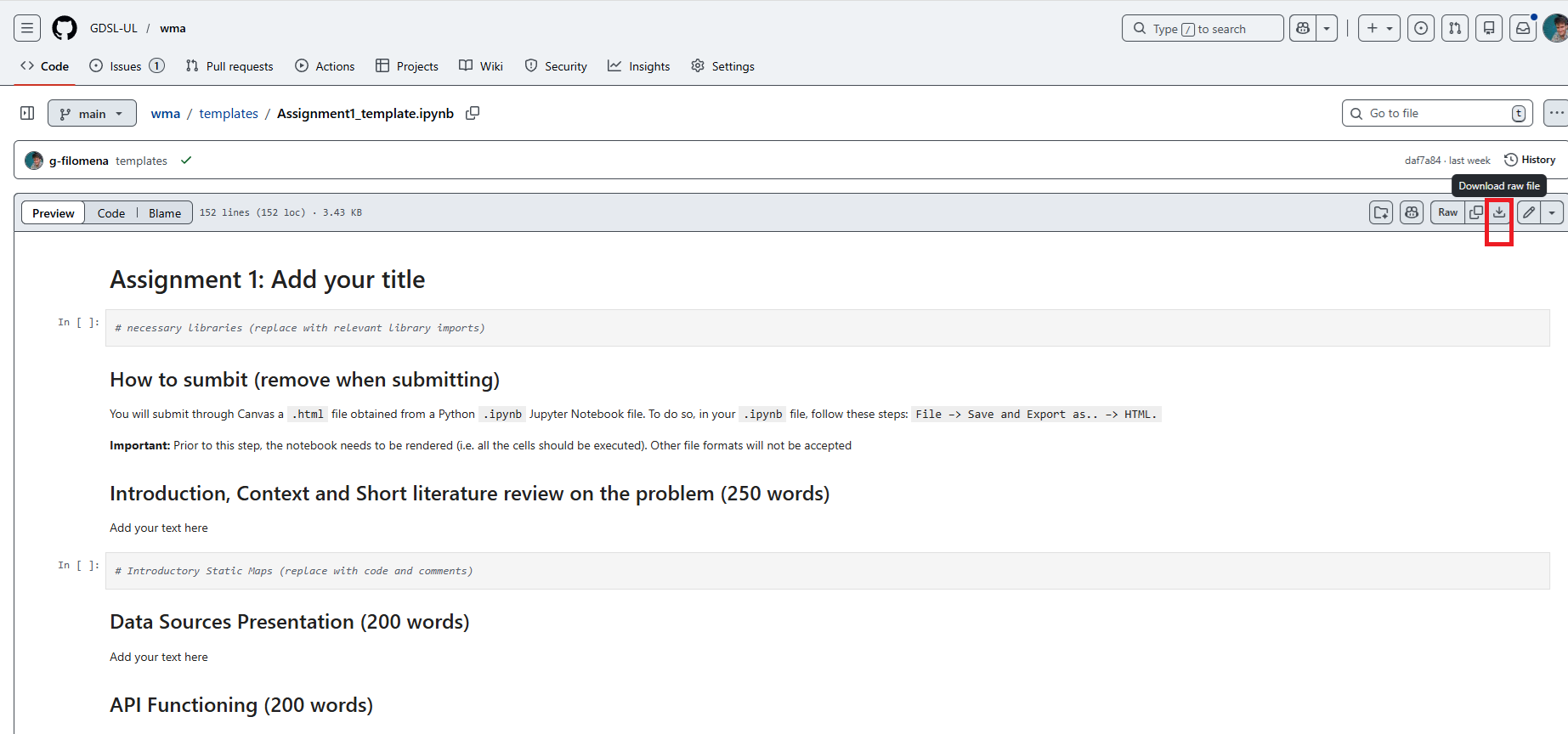 You will submit through Canvas a .html file obtained from a Python .ipynb Jupyter Notebook file. To do so, in your .ipynb file, follow these steps: File –> Save and Export as.. –> HTML. Prior to this step, the notebook needs to be rendered (i.e. all the cells should be executed).