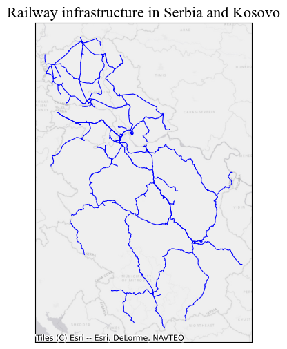 ax.set_title("Railway infrastructure in Serbia and Kosovo", **title_parameters) #parameters as aboveText(0.5, 1.0, 'Railway infrastructure in Serbia and Kosovo')