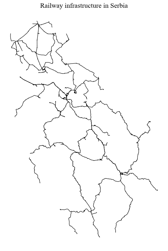 ax.set_title("Railway infrastructure in Serbia", **title_parameters) #parameters as aboveText(0.5, 1.0, 'Railway infrastructure in Serbia')