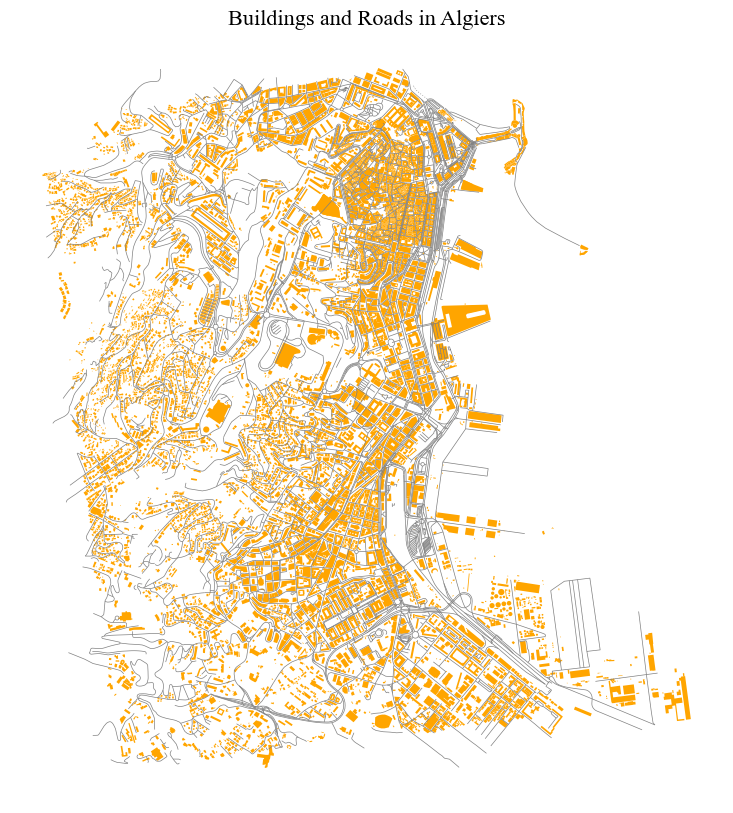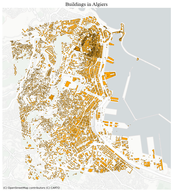 We are again using OSMNX to download data from OpenStreetMap automatically. In this case, we will get building footprints from the city of Algiers in Alageria.