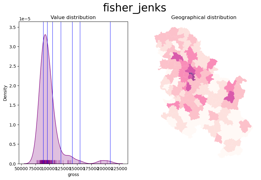 Cartograms are maps that represent the spatial distribution of a variable not by encoding it in a color palette but rather by modifying geographical objects. There are many algorithms to distort the shapes of geographical entities according to values, some of them are rather complex.
