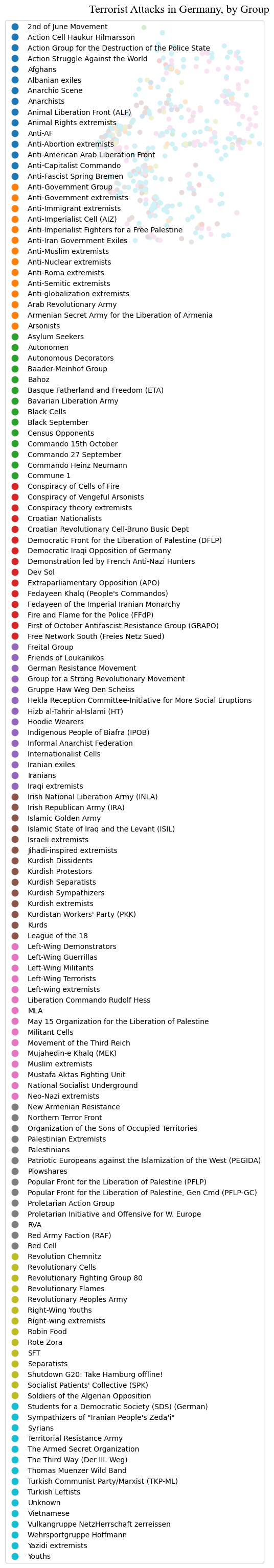 ax.set_title("Terrorist Attacks in Germany, by Group", **title_parameters) #parameters as above